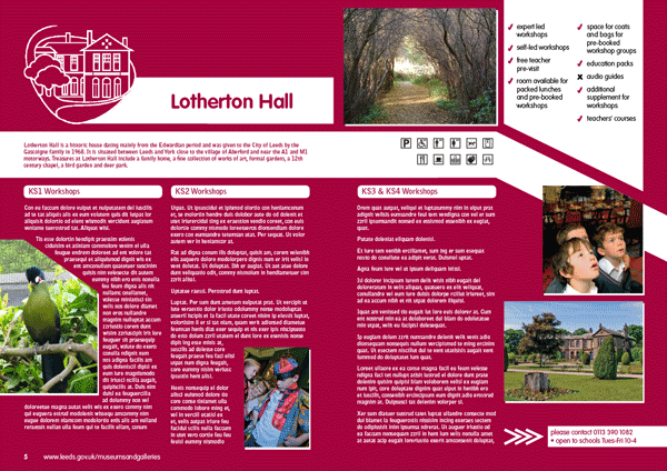 An example spread and front cover for a brochure presenting large amounts of information about local museums and galleries to school teachers. It was produced whilst on a placement with Studio Belly Timber, as part of a tender for Leeds City Council.