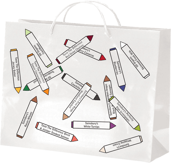 This competition brief for Sainsbury’s asked for artwork to appear on limited edition bags, celebrating one of the company’s key issues. The solution links the removal of artificial colours from soft drinks with a light-hearted colour-by-numbers illustration of Jamie Oliver in the bath, surrounded by fruit.